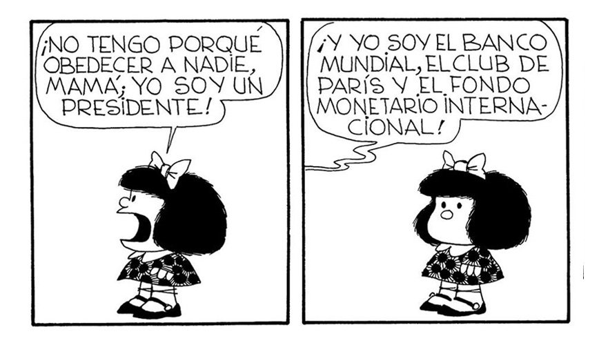 Особенно часто Мафальда любит говорить о политике. Например, в этом комиксе высмеивается роль президента, который считает себя абсолютно самодостаточным.